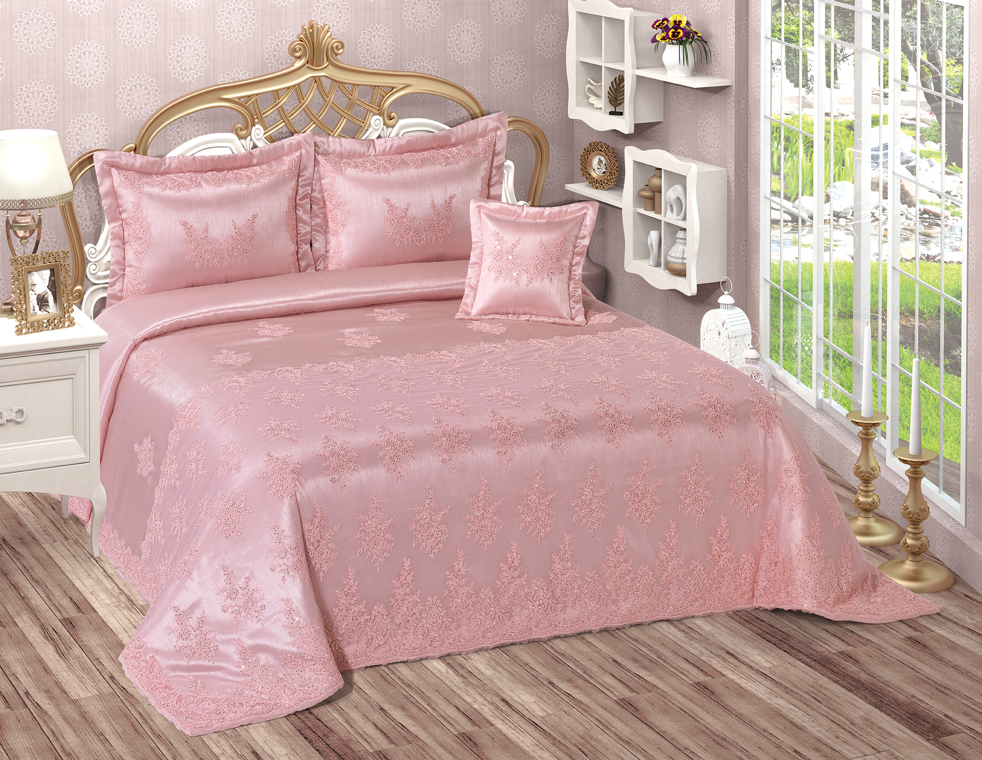 Satanet kumaş üzerine kullandığımız Işıltılı dantel, göz alıcı bir yatak örtüsü hayal edenler için tasarlandı.