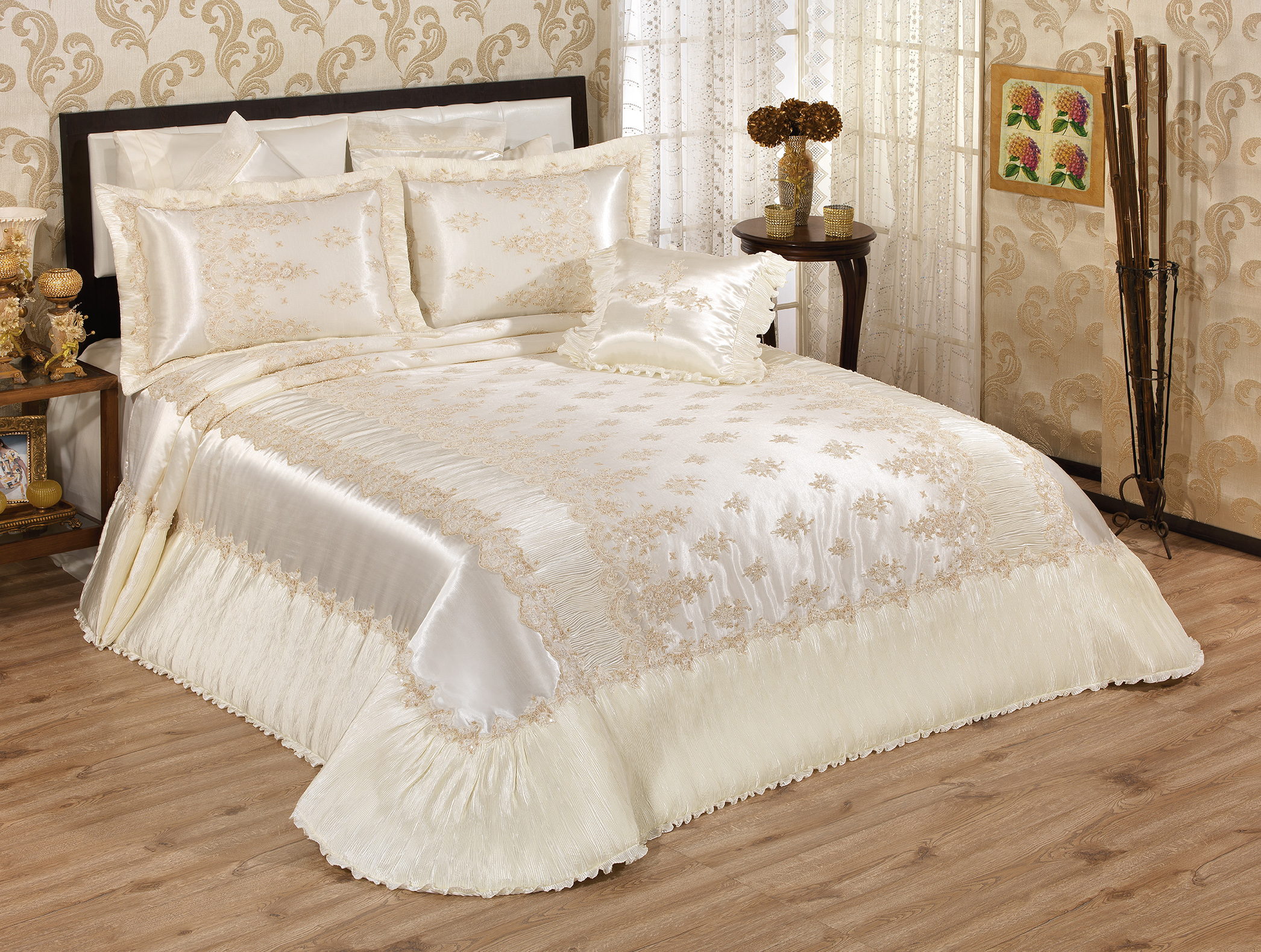 Lüksü sevenler , satanet kumaş üzerine fransız dantellini esirgemeden kullandığımız, Defne Yatak Örtüsü, sizin için..