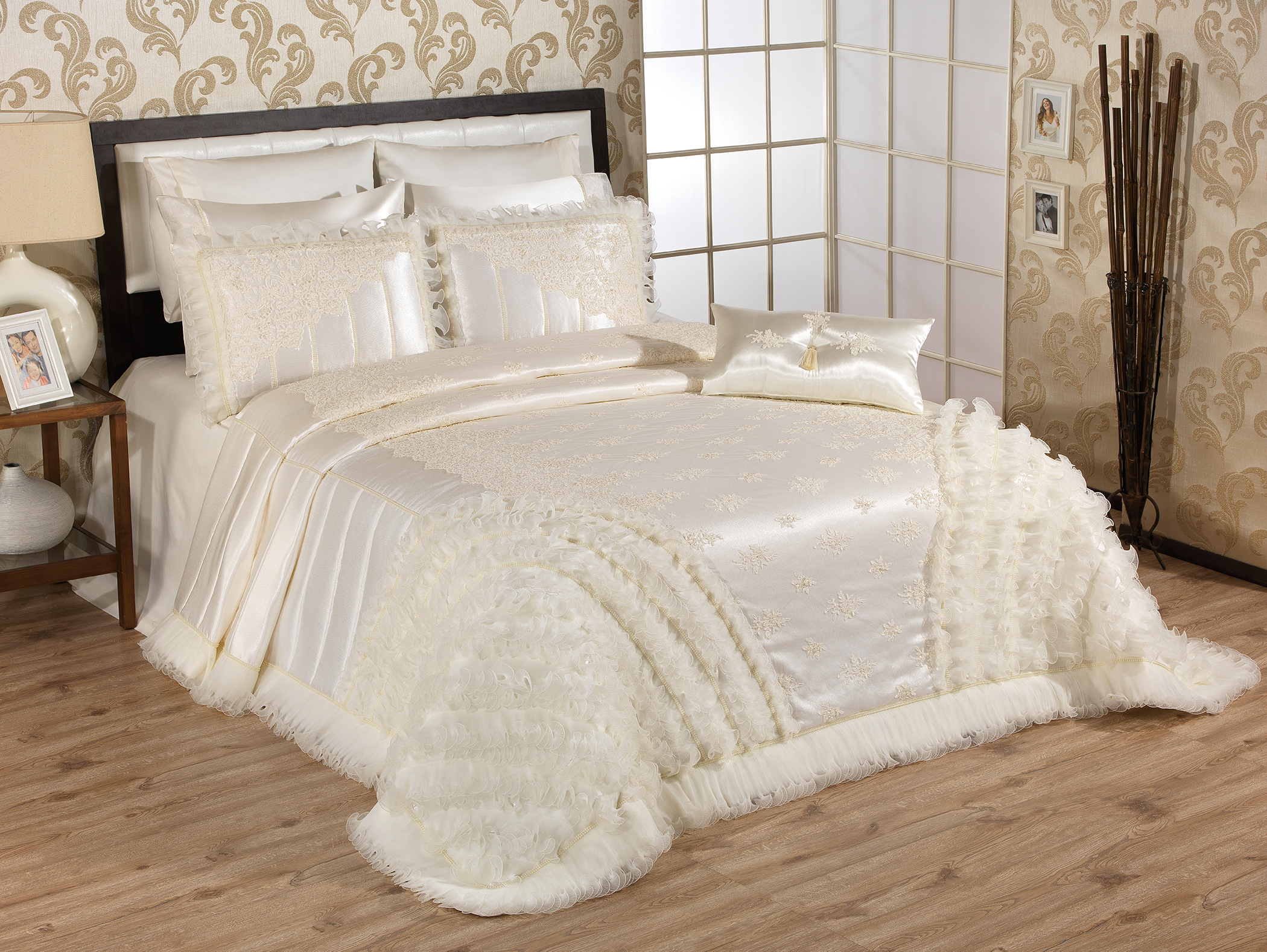 Yatak Örtüsü kolleksiyonumuzun nadide parçası Deniz İncisi Yatak Örtüsü'nde Fransız Dantelini dalga görüntüsündeki fırfırlarla bezedik.