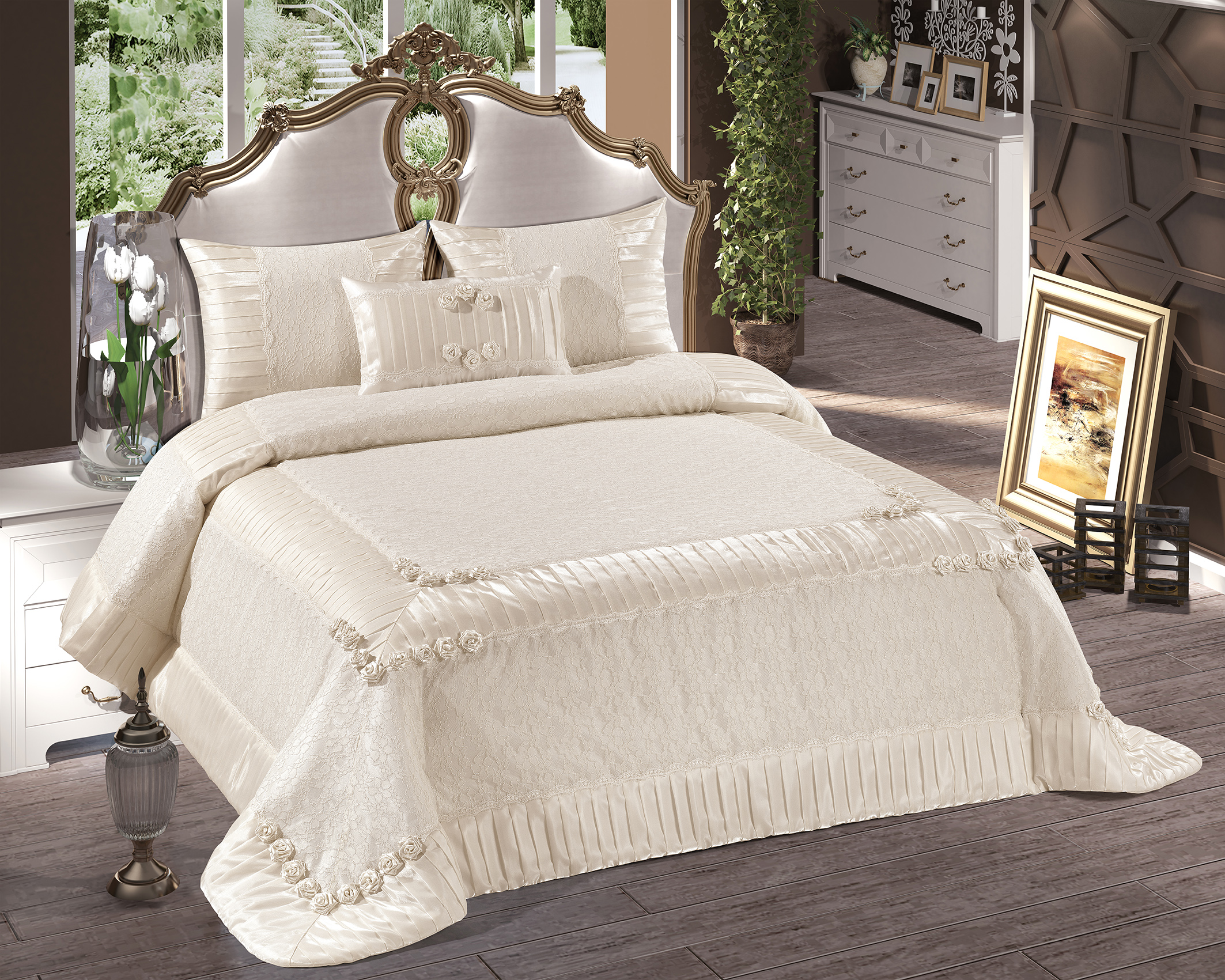 Monoray kumaş, piliseli etekler, üzerine jakarlı tül ile kombine çalışılmış Eylül Yatak Örtüsü, odanıza şıklık katacak...