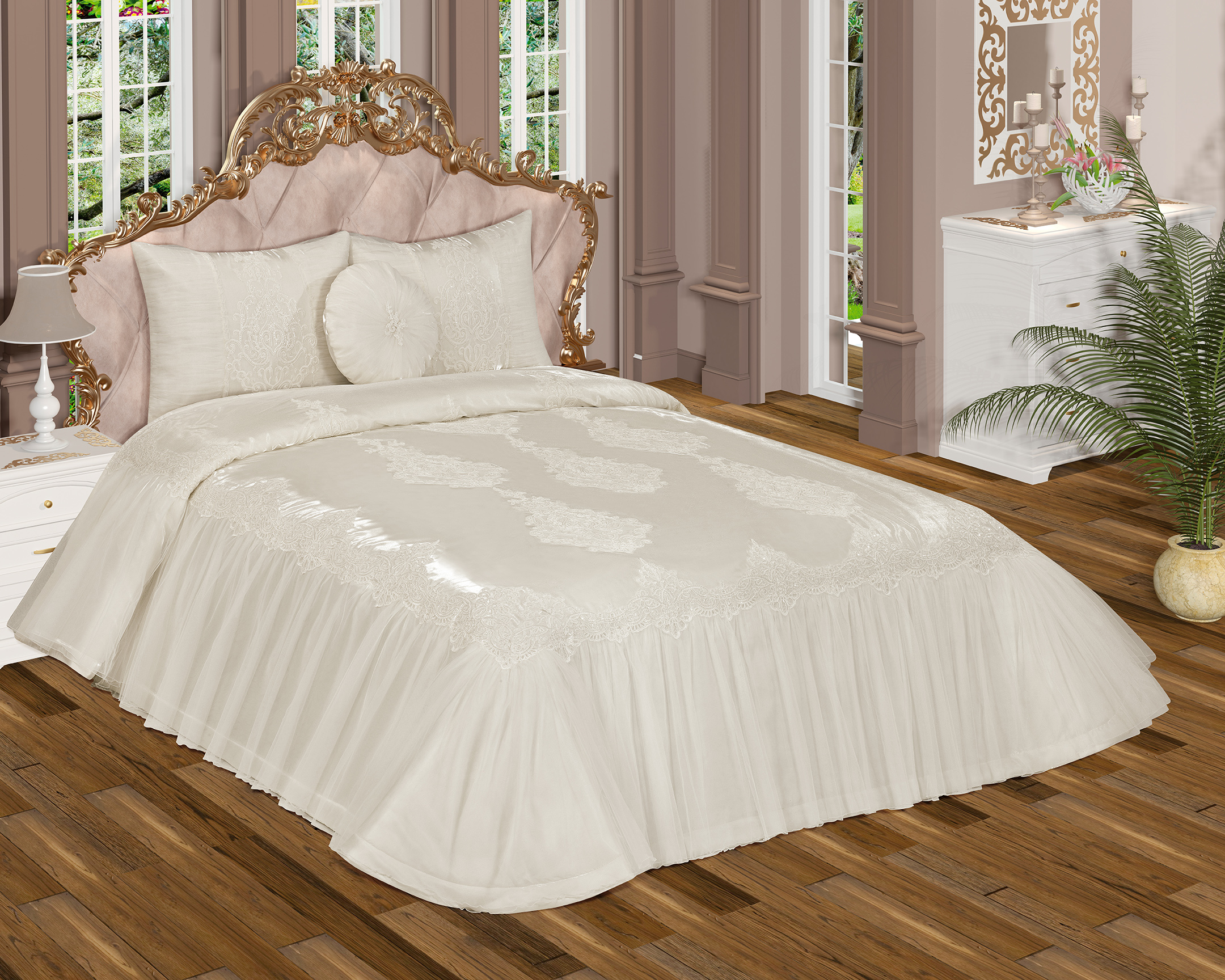 Gelin yatağına layık bir örtü, Gelin Yatak örtüsü; tül pilise ile tasarlanan yuvarlak yastığı ve üzerinde kullanılan Fransız danteli aplikleri ile adeta büyülüyor.