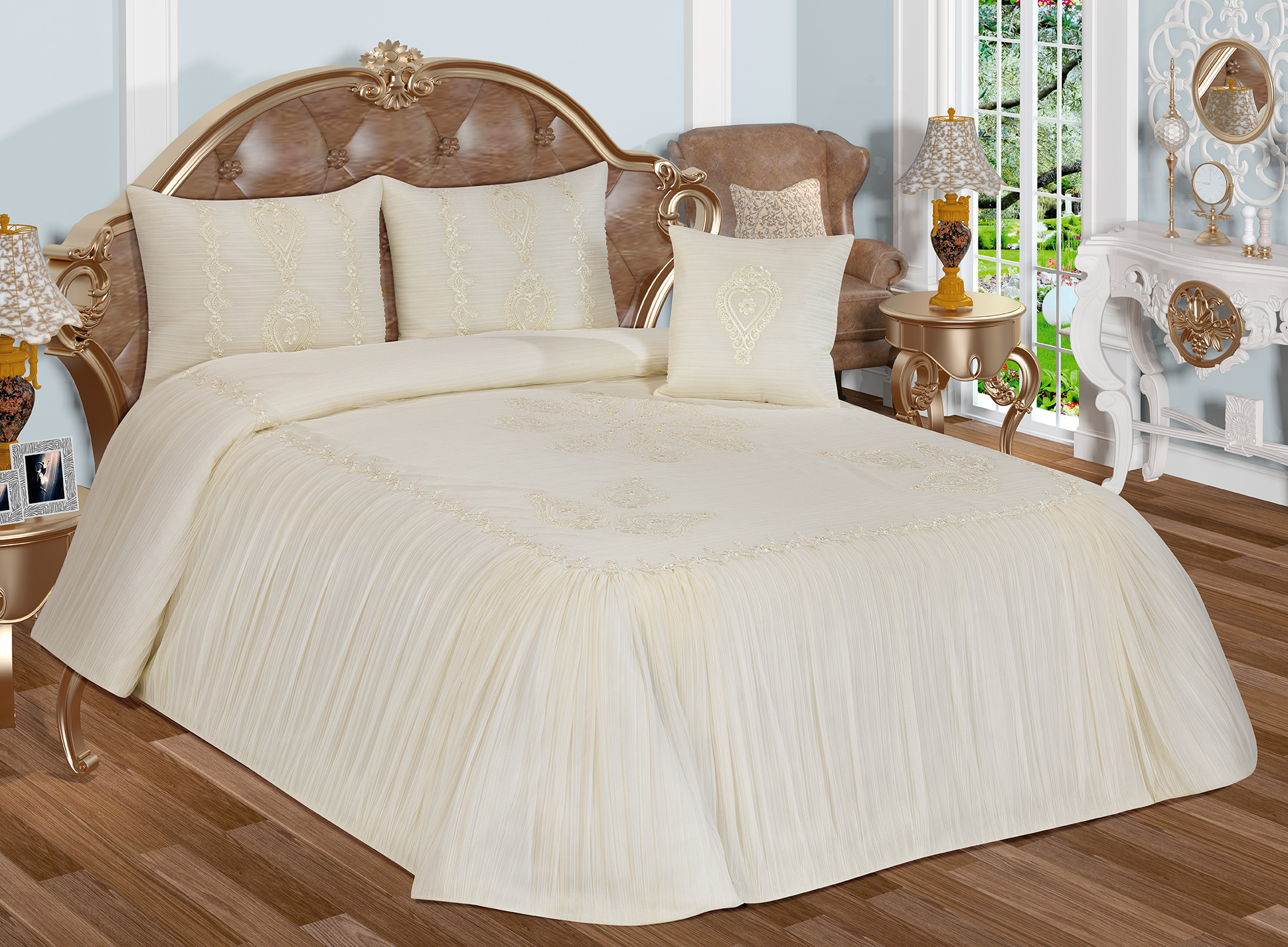 Dantelin şıklığı, pilisenin göz alıcılığı bu yatak örtüsüyle odanızı zarifleştiriyor.