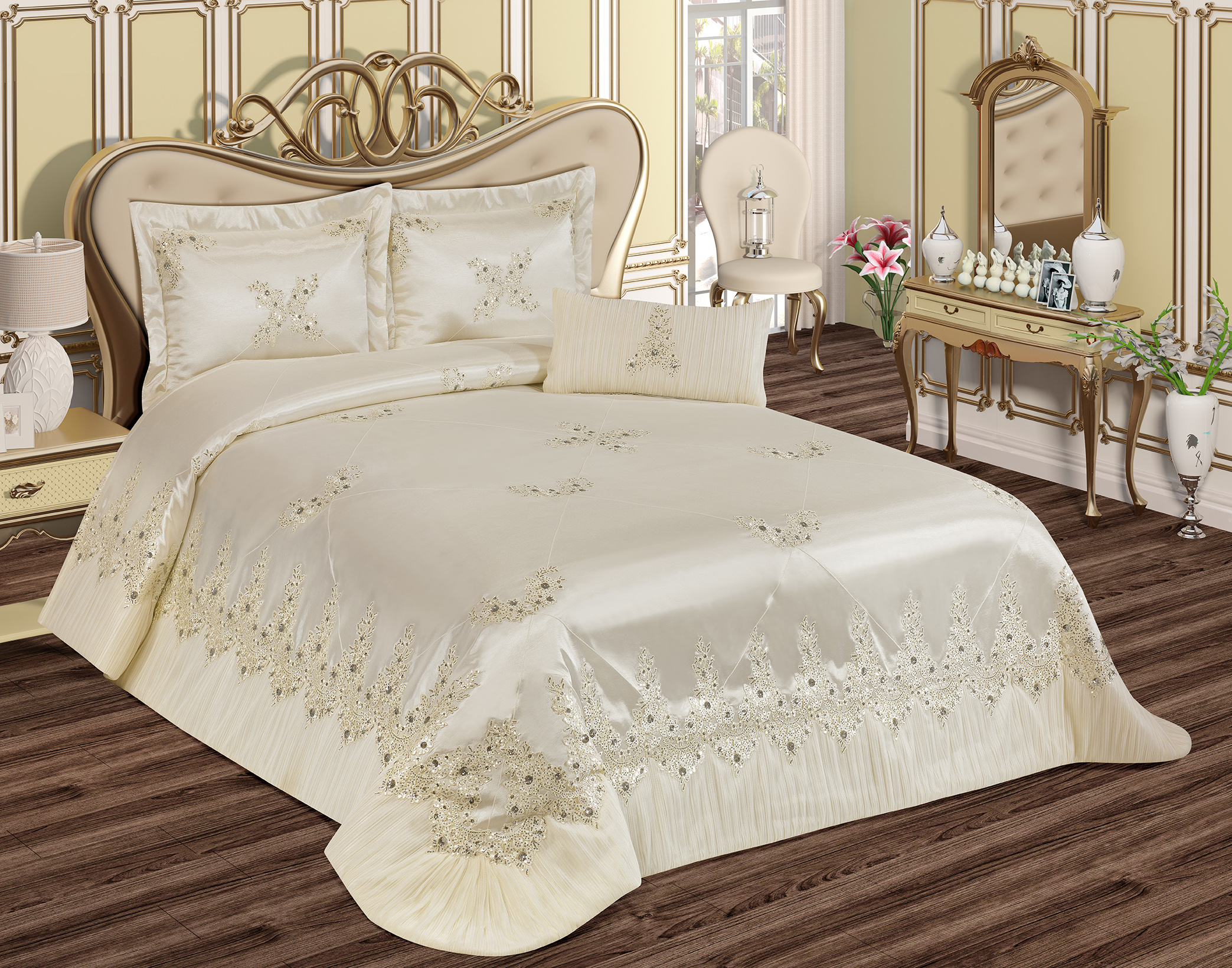 Tül piliseli süs yastığı ve etekleri, satanet kumaşa mükemmel işçilik ile yerleştirilmiş pullu dantelleri ile Nervür inceliğini hep birlikte harmanladığımız Nalan Yatak Örtüsü evinizi adeta saraya dönüştürecek.